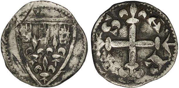 Revers : Dans un grènetis, croix longue dont les branches horizontales sont fleuronnées et les branches verticales fleurdelisées. Dans les cantons des lettres