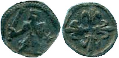 Avers : Dans un grénetis, guerrier casqué marchant vers la droite, tenant de la main droite une épée levée et de la main gauche un ecu vide.