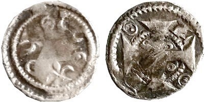 Avers : Dans un double grènetis. Triangle avec à chaque sommet un annelet pointé et dans les cantons trois fleurs de lis