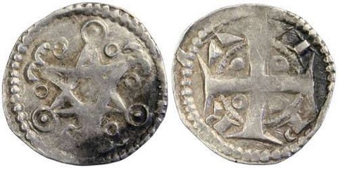 Avers : Dans un grénetis, deux petits triangles superposés en sens inverse, les sommets de l'un terminés en un annelet pointé et ceux de l'autre en une fleur de lis.